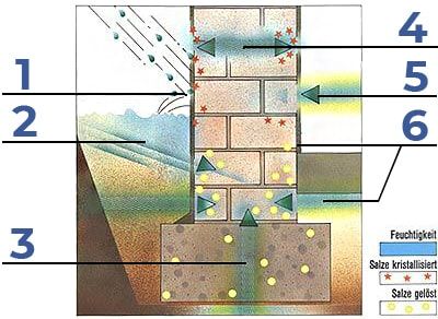 Die im erdberührten Bereich aufsteigende Feuchtigkeit wird kapillar aufgenommen und steigt mit gelösten Salzen in die trockenen Mauerwerkszonen. Hier verdunstet das Wasser und die Salze bleiben zurück. Dieser Vorgang wiederholt sich ständig.